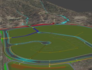 A construction-ready drainage model – including catchments, pits, pipes, culverts, channels and flood extents – is created from scratch in 3D and designed for specified minor and major storm events using the Rational Method. Output plans, long-sections and calculation tables are also produced.